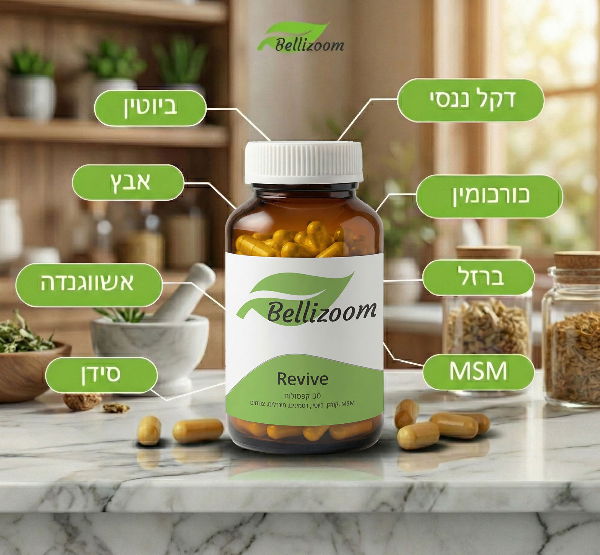 Revive של Bellizoom הוא תוסף תזונה שנבנה כדי לתמוך בשיער מבפנים החוצה: פורמולה מדויקת עם 21 רכיבים טבעיים פעילים, ביניהם גם רכיבים מוכרים לשיער דליל ונשירה (כולל דקל ננסי כחלק מהגישה ההוליסטית). היתרון המשמעותי הוא הסינרגיה: במקום להסתמך על רכיב אחד, את/ה נותן/ת לשיער “מעטפת” שלמה של ויטמינים, מינרלים, חומצות אמינו ותמציות צמחים—כדי לתמוך בשורש, בקרקפת ובאיכות השערה לאורך זמן.